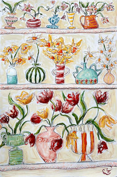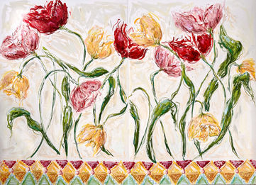 Through my paintings, I aim to capture this balance, celebrating the fleeting charm of each flower while honoring the timeless cycle of the seasons. I paint intuitively, taking inspiration from my time in the garden and drawing upon details stored in my imagination. The colors and compositions in my work are influenced by the movement of flowers, the juxtaposition of geometric patterns which highlight the intricacies of the flowers, and the changing palette of the garden.